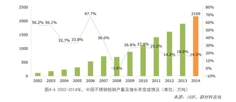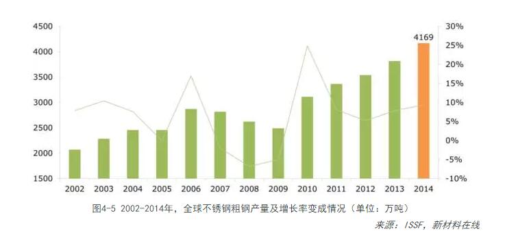 1912年,不銹鋼被發(fā)現,1916年開(kāi)始大量生產(chǎn),不銹鋼進(jìn)入規模性工業(yè)化生產(chǎn)已有90多年時(shí)間。在不銹鋼生產(chǎn)工藝技術(shù)不斷進(jìn)步和市場(chǎng)需求的推動(dòng)下,近20年來(lái)世界不銹鋼產(chǎn)業(yè)獲得加速發(fā)展。據國際不銹鋼論壇(ISSF)公布的臨時(shí)數據顯示,2014年全球不銹鋼粗鋼總產(chǎn)量為4169萬(wàn)噸,同比增長(cháng)9.3%。