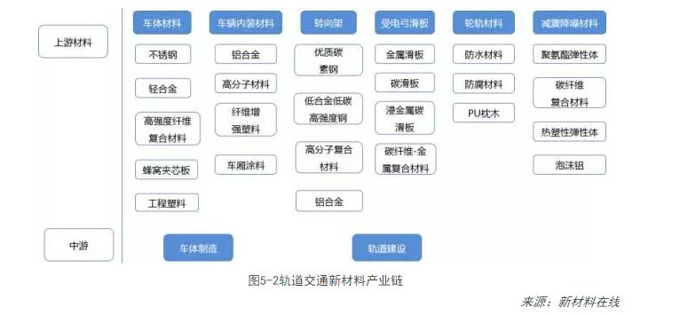 軌道交通將帶動(dòng)上游相關(guān)材料快速發(fā)展,其與材料相關(guān)主要是原材料領(lǐng)域、基礎建筑領(lǐng)域、關(guān)鍵部件領(lǐng)域和其他配件領(lǐng)域。原材料主要指鋪軌階段和列車(chē)制造階段大量使用的鋼材、鋁材以及水泥等非金屬建材;基礎建筑材料指軌道交通建筑施工、建筑裝修等相關(guān)材料;關(guān)鍵部件材料包括減震防噪原件、減速部件、車(chē)廂涂料等先進(jìn)技術(shù)和新材料為核心的軌道交通核心材料;其他配件包括玻璃纖維枕木、特種電纜、LED顯示器等。