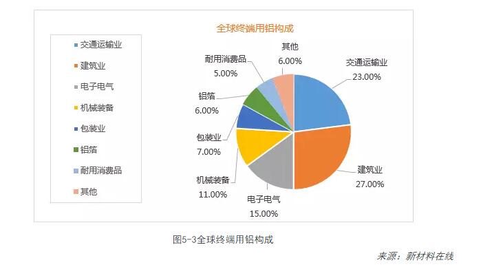 鋁材的應用非常廣泛,小到拉鏈,手機,易拉罐,大到輪船,火車(chē),飛機等。鋁材的用途可以主要分為建筑業(yè),交通運輸業(yè),電子電氣及機械裝備等。分析全球鋁消費的終端構成可以看到,交通運輸業(yè)占比27%,也即1400萬(wàn)噸鋁,而交通運輸包括汽車(chē)、軌道交通、船舶、飛機等。
